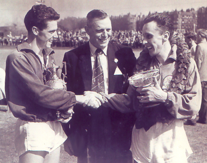 Allan Scally is pictured here with two athletes he coached to success. On the left is Graham Everett, the 1958 AAA 1 mile champion, and on the right Joe McGhee, the 1954 Empire Games marathon champion. The photograpgh was taken at the S.A.A.A. championships at Meadowbank in 1956.